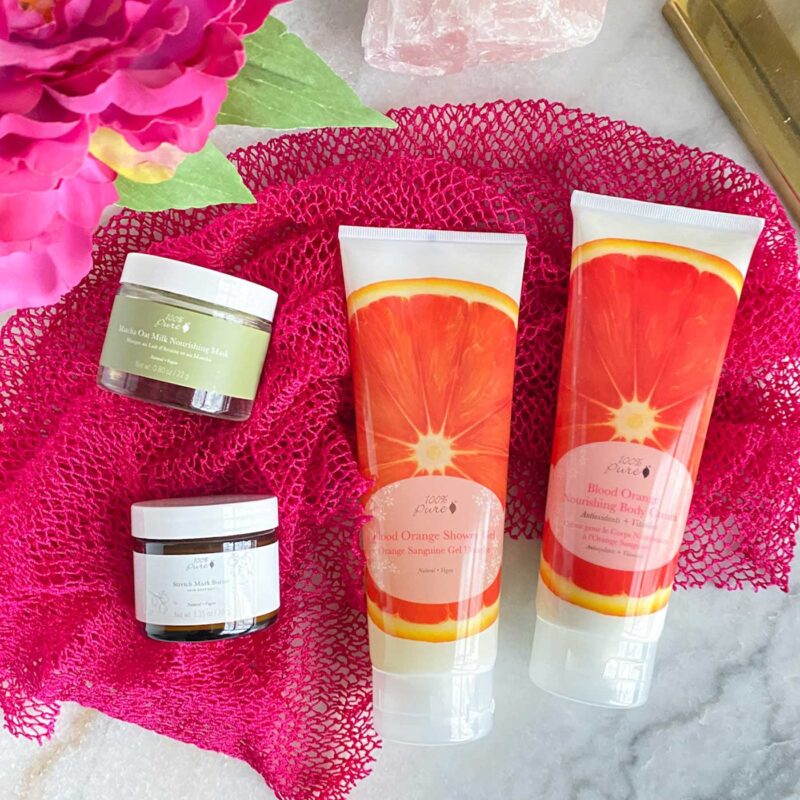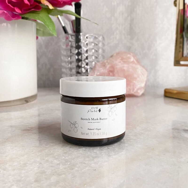 Once you’ve spent all of this time with treatment products, I like to finish strong with super hydrating products to make my skin even more glowy. I typically pull out a couple of different moisturizers/balms, and I apply them to very specific areas to take advantage of all their benefits! I like a balm that offers other benefits like the 100% Pure Super Fruit Balm for my face and particularly dry areas. 100% Pure Skin Support Stretch Mark Butter goes on any areas with stretch marks (my stomach and things mostly), and then I follow it up with the 100% Pure Nourishing Body Cream to all of the other areas.