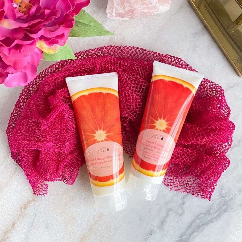 Once my masks have completed their thing, I like to get in the shower to quickly and easily wash everything off. But since I’m in the pampering mood, I definitely use pampering products! I love to use scented body wash, scrubs and lotions in the shower. I will match the scent of all the products, and typically I’m a sucker for anything orange scented (pictured here are the 100% Pure Blood Orange Shower Gel and Nourishing Body Cream). However, the Lavender and Honey Almond scents are also pretty amazing!